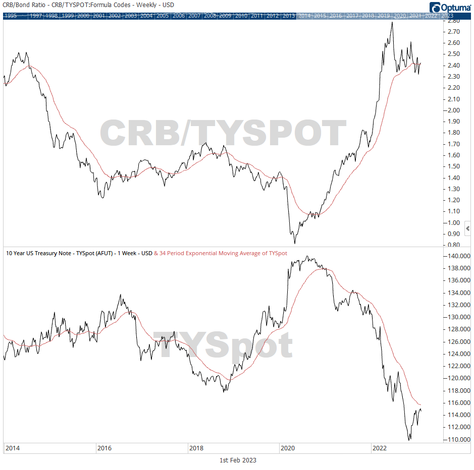 The US Dollar Index is down -1.6% year to date, giving back grounds of 11.5% from its high in Q4/2022. Relative weakness in the US Dollar resulted in grounds gained for major US trading partners — Swiss Franc, Japanese Yen, Euro, and the British pound. The overall trend in DXY is negative — signified by the downtrend in the weekly 13/34 weekly EMA model. Fluctuations in the US Dollar can reverberate across various markets, but it is primarily filtered through in the commodities market. Relative weakness in the dollar is a positive development for commodities, and vice-versa. The ‘Thomson Reuters/Jefferies CRB Index’ has been consolidating on the dollar’s relative weakness since Q2/2022, following a substantial decline of nearly 20% from summer highs. Year to date, The CRB Index is down -2.14% despite early advances in precious and base metals such as Copper and Gold, advancing 11% and 7%, respectively. The consolidation in crude oil and agriculture have weighed down overall index performance.