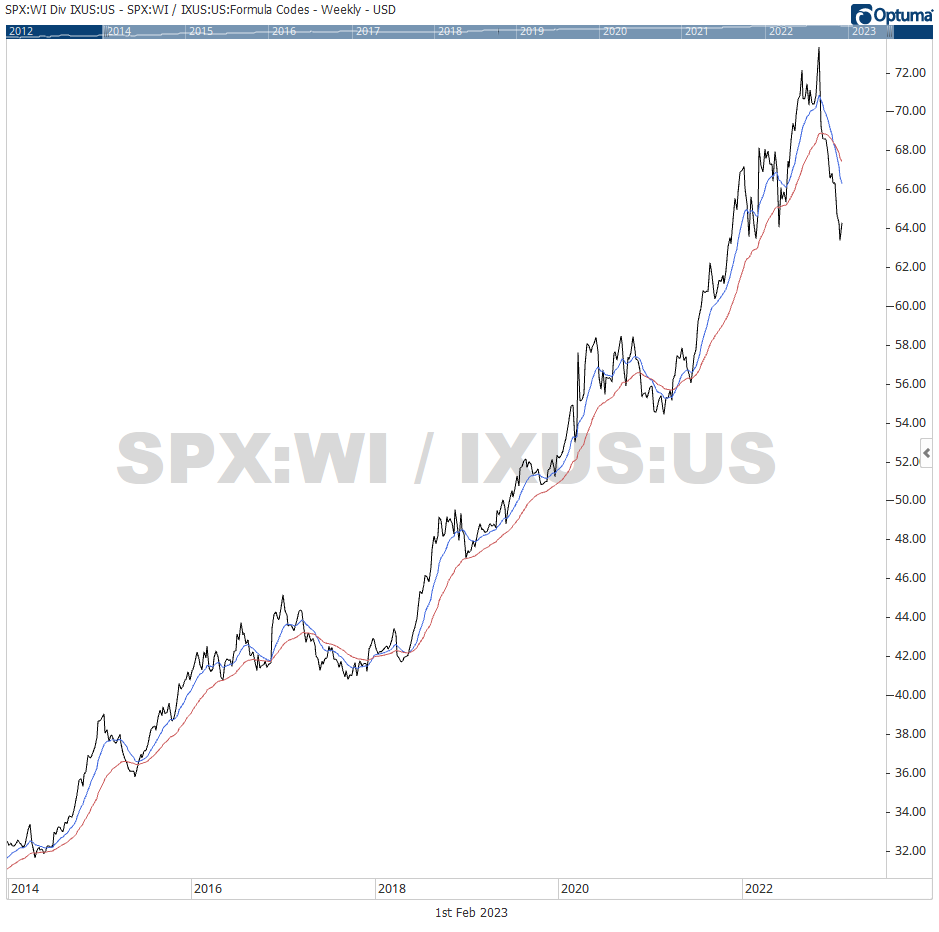 The Commodities/Bonds ratio continues to consolidate from Q2/2022 peaks into early 2023, potentially providing hints of ‘peak’ inflation. A falling ratio generally benefits rate-sensitive areas of the market, while a rising ratio favors staple commodities such as energy, gold, basic materials, and resource products – raising attention to rising inflation and interest rates, highlighting the positive correlation between commodity prices and bond yields. Yields on the 2-30 US Year Treasury bonds have reverted to their 34-weekly moving averages, resulting in advances in US bond prices. The US 10 Year Treasury Notes have gained nearly 2.8% since the 10 Year yields declined by nearly 20% from 2022 highs of 4.33%. AGG, the iShares Core U.S. Aggregate Bond ETF aiming to replicate the performance of a composite of the US investment-grade bond market has gained 3.8%, year to date. Bond investors are expecting central banks to cut interest rates during the later stages of 2023 due to expectations of an economic slowdown that will remedy persistent inflation problems quicker than the undertaken monetary actions. Investor demand for international bonds expanded in January as European Governments sold nearly $75 billion of new issues and roughly $60 billion were issued in emerging markets — an improvement in market activity.