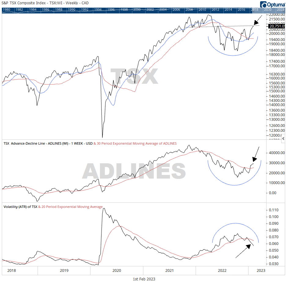 Home court, the TSX Composite Index shows early leadership to the S&P 500 on the strength of basic materials, particularly gold and mining companies. Our primary barometer is up 7%, while the TSX 60 — Canada’s blue chip index, and the TSX Smallcap Index are up 6..8% and 9.7% respectively. The headlining index advanced from its Q4/2022 lows and has seemingly absorbed overhead supply near an established resistance area of $20,500. Breadth expansion (rising TSX Composite Advance/Decline Ratio) is notable on the advancement and nearly 85% of index constituents are trading above their respective 200 day moving averages. As well, volatility, highlighted by the 20-period Average True Range, is contracting on constructive market developments. It will be worthwhile to monitor the developments in the credit market during the first half of 2023 and how the rate-sensitive sectors will respond. Cyclical sectors have thus far shown early market leadership, and while the United States has lagged international markets so far (including Canada), it would be too early to be counted out.