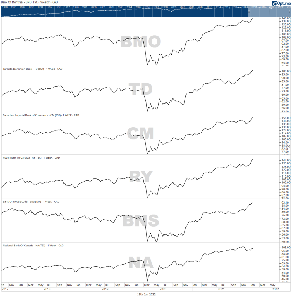 BMO, TD, RBC, CIBC, and Scotia Bank are heading in the same direction while carving out new highs on their way up.