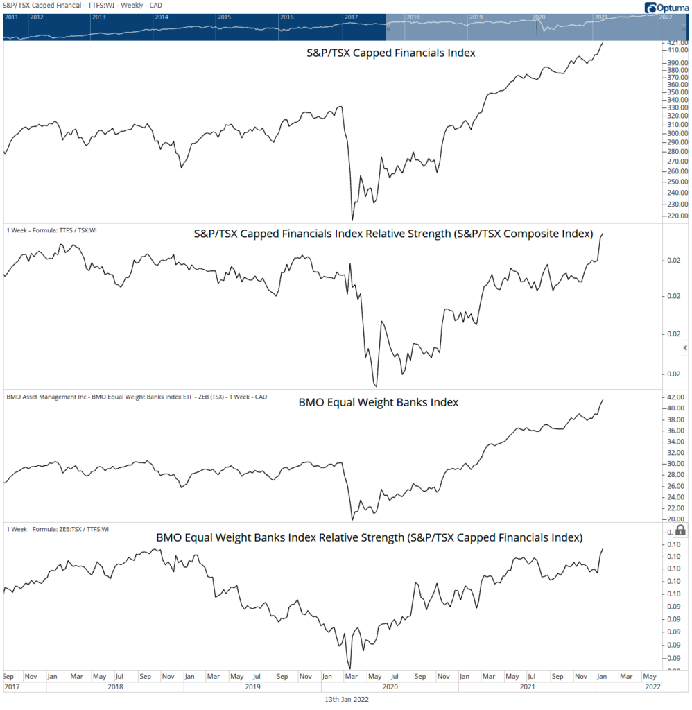 The S&P/TSX Capped Financials Index is in a strong trend – ascending peaks and posting new highs each leg up. Adding wind to the sails is the exchange traded fund inflow of $2,735 million to Canada’s financial sector in 2021, piling new money and momentum to the space. Relative strength to the S&P/TSX Composite Index is expansive, confirming a bullish sector. From March 2021 to November 2021, relative strength was rangebound, highlighting a period of price consolidation; performance was in line with the S&P/TSX Composite Index. Upward resolution in relative strength near year-end added confidence to the sectors bullish trajectory, and here we are.