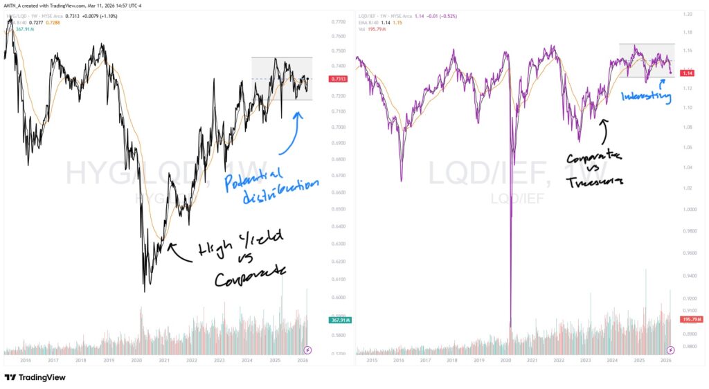 - iShares iBoxx High Yield Corporate Bond ETF vs. iShares iBoxx Investment Grade Corporate Bond ETF: This ratio has entered a period of consolidation—a breakdown here would signal a rotation toward blue chip debt as default fears rise.