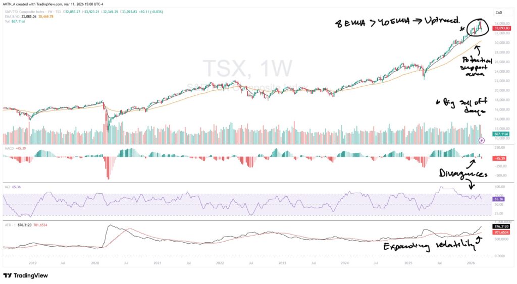 The S&P/TSX Composite has undergone a powerful rally, advancing approximately 56% from its 2025 lows to its all-time high of $34,544 in early March. However, while the index continues to trade near all-time highs, a notable divergence is emerging between price action and underlying technical health. Specifically, the gains observed since late 2025 have not been corroborated by momentum oscillators such as the MACD, nor by significant capital inflows as shown by the Money Flow Index (MFI).