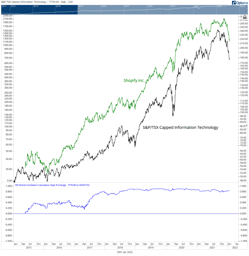 Accounting for roughly 20% of the sector, much of the decline in the group is attributed to the sector’s former largest company by market capitalization. Shopify Inc. stock value shrunk by another 19.66% to end the week, and is -36.25%, YTD. All constituents of the S&P/TSX Information Technologies Index are in negative territory. However, investors interested in the sector would benefit from analyzing Shopify’s price structure.