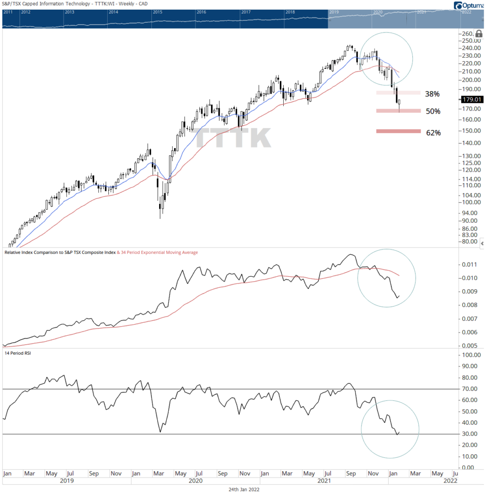 S&P/TSX Information Technologies Index is out of favor until the 13/34 weekly EMA re-establishes a green light.