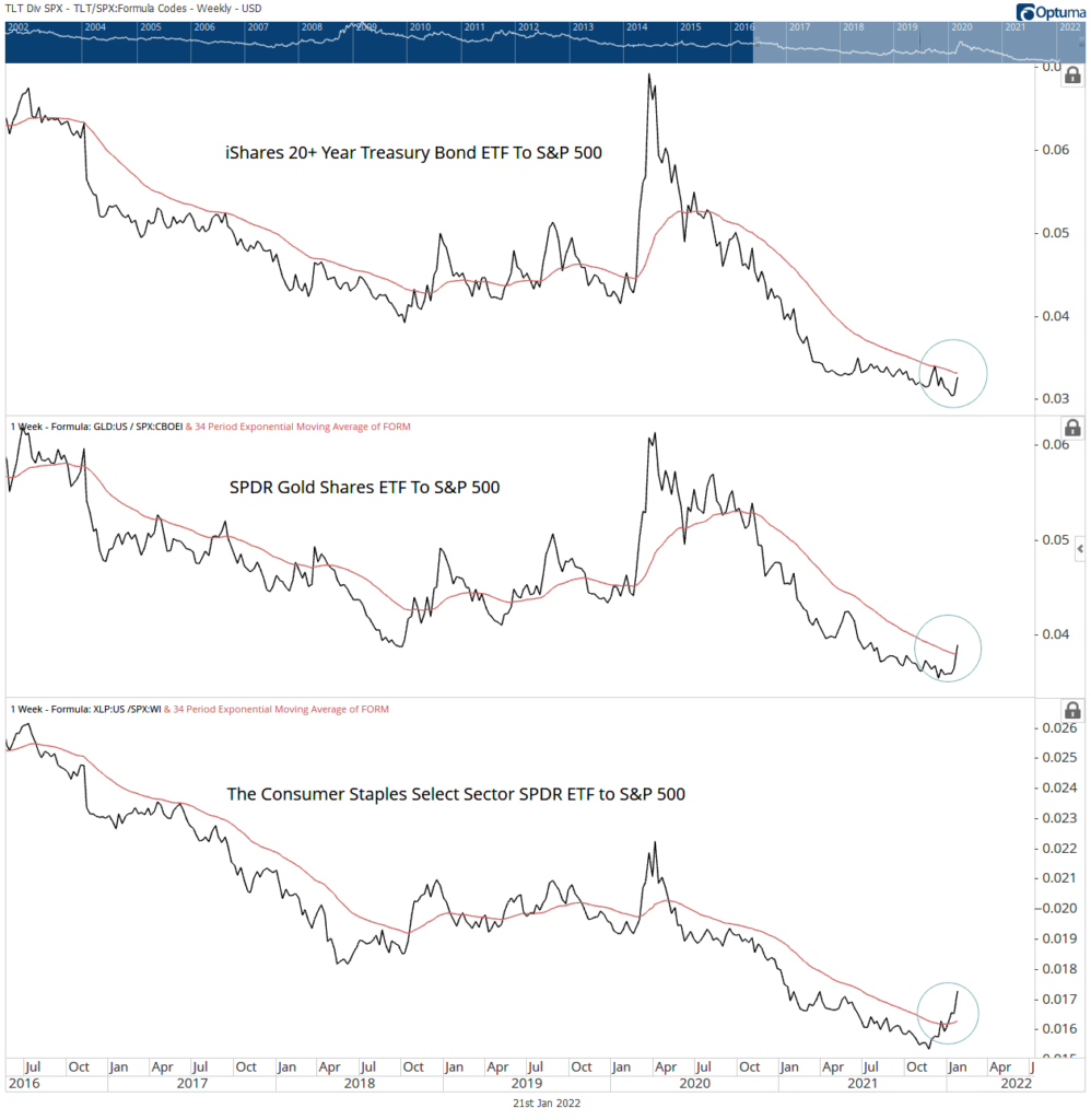 In periods of turbulence for equity markets, risk-on appetite wanes as investor preferences for ‘safe-haven’ securities increase. Assets like gold, US treasuries, consumer staples, and key currencies (Japanese yen, Swiss franc, US dollar, etc.) attract global investors seeking portfolio diversification benefits. The expanding relative strength of the iShares 20+ Year Treasuries, SPDR Gold Shares ETF, and the SPDR Consumer Staples Sector ETF to the S&P 500 highlight bearish sentiments in equity markets and flight to safety ensues. Although systematic risks are unavoidable, safe-haven assets have provided a cushion during bumpy rides, temporarily serving as a store of value.