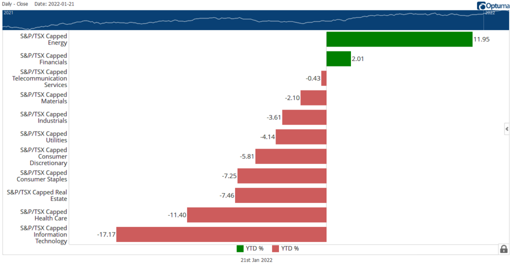 Prospects of higher rates continue to weigh on equity markets. Global stock markets outside the United States, iShares MSCI ACWI ex U.S. ETF for reference, closed the week, down 3.12%, accentuating the broader sell-off. In the US, the Nasdaq Composite Index, S&P 500, and Dow Jones Industrial Average were negative across the board, -7.55%, -5.68%, and -4.58%. The Nasdaq, gathering the most attention entered the ambiguous correction territory, furthering bleak outlooks. Littered with growth stocks, the index, comprised of a 50% Technology sector weighting, continue to absorb flurries of punches to the chin as rate hike expectations intensify – potentially dampening corporate earnings and stock values. Up north, the S&P/TSX Composite Index and and S&P/TSX 60 followed the course, -3.45% and -3.56% respectively to end the week.