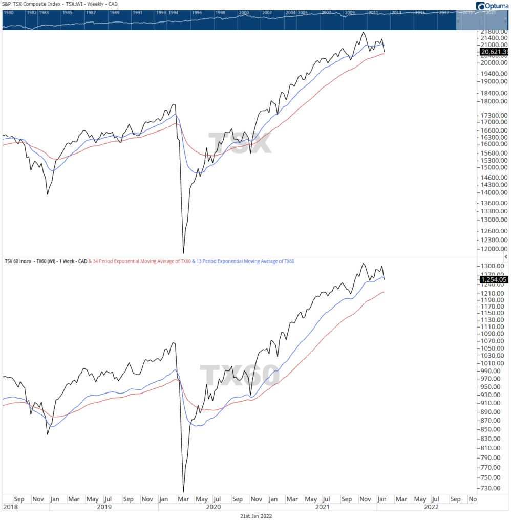 Notwithstanding current sentiments, the 13 EMA remains above the 34 EMA for both the S&P/TSX Composite Index and the S&P/TSX 60 – in short, it’s still game time. That said, the bond market is not to be disregarded. Relative strength in US treasuries pose concerns for equities, and risk must be kept on a very short leash.