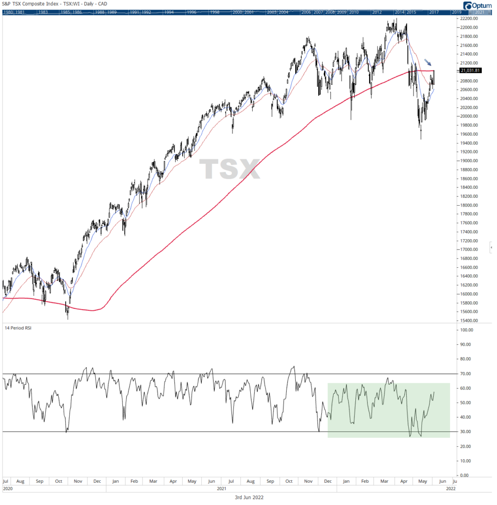 The 14-period RSI oscillates near its lower regions, indicating that the average losses are greater than the average gains. So, for the TSX to resume a bullish trend, breadth expansion is important and needed – more stocks need to be advancing to support a sustainable rally.