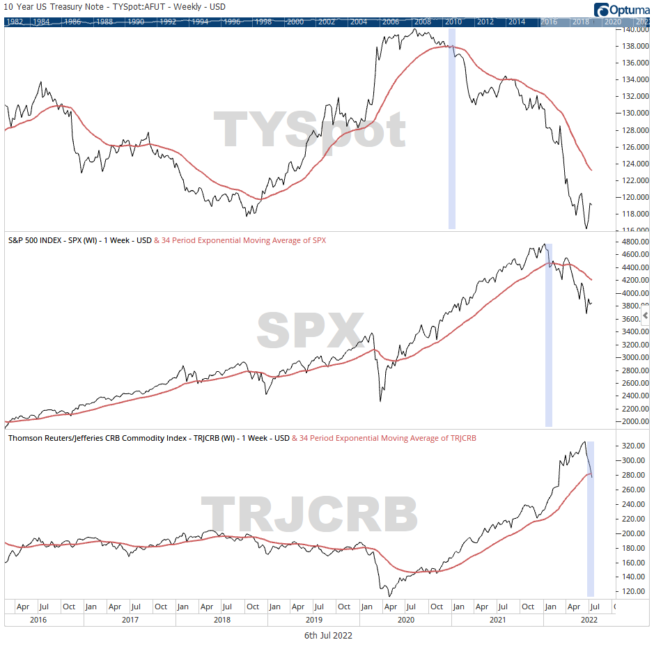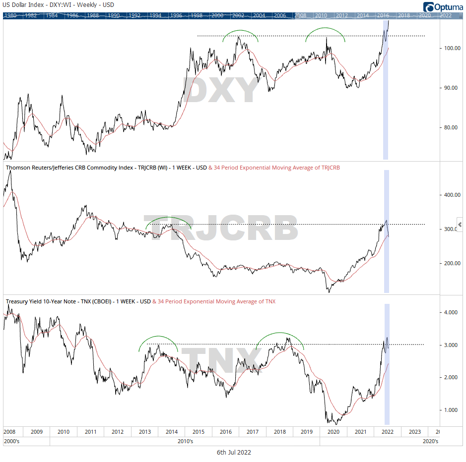 Bond yields and bond prices move in opposite directions, and bond prices and stocks generally move in a similar heading, long term. Bond prices tend to peak and trough ahead of stocks, and commodities last — providing valuable market information. The 10 Year Treasuries Yields, a benchmark for the cost of money and yardstick for investor confidence, crossed below its internal 34 weekly EMA in late 2020 on rising interest rates. The S&P 500, barometer for US large-cap equities, peaked at the later half of 2021 and crossed below its 34 EMA as tightening policies cautioned risk-off investor appetite. A persistent rise in the US Dollar tends to weaken commodities, impact exporting transactions, and reduce the value of overseas earnings of multi-national corporations. Bond prices have fallen, equities have fallen, and commodities look to be following, in an orderly fashion? The CRB Index has fallen by 16% from May highs. And, the US Dollar looks to continue playing an influential role ahead.