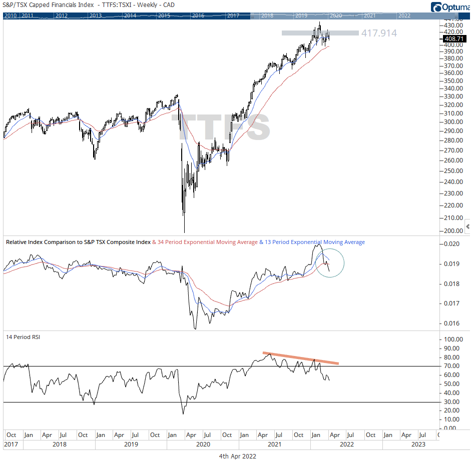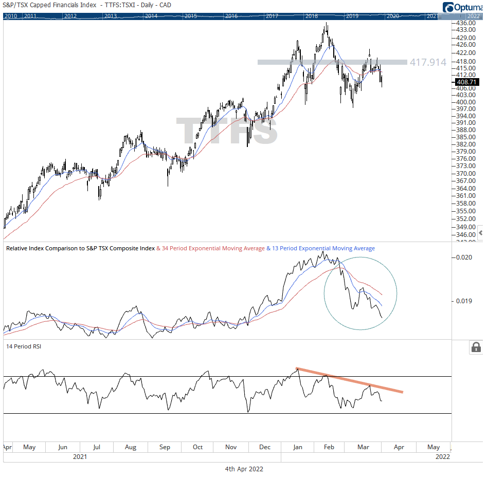 From a longer-term perspective, the S&P TSX Capped Financial Index looks fine, but relative strength and momentum divergence caution for attention.